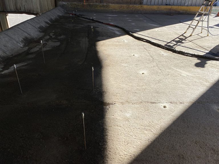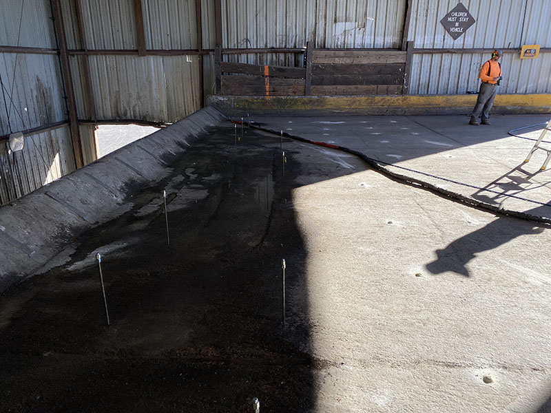 After hours we arrived with two crews and two separate trucks to get this job done in a timely manner so that they would be ready for their normal work schedule the next day. First, we drilled entry holes through the 8-inch-thick concrete so that we could install our injection rods in a grid pattern to cover the entire area. We used a two-part structural foam to fill the voids and stabilize eroded and loose soils as well as to lift the concrete. Some injection sites we went as deep as 12 feet to fill the void. Some areas took more material than others. During a process like this we use special meters to detect movement as well as two-man crews on each truck so that we can watch the gauges in the truck to determine the amount of material needed. We filled all of the voids as well as lifted the 8-inch-thick panels back to their original grade and height. Our material is 90% strength in 15 minutes so by morning it was all the way cured and ready for the normal use of the heavy equipment used daily at the transfer station.